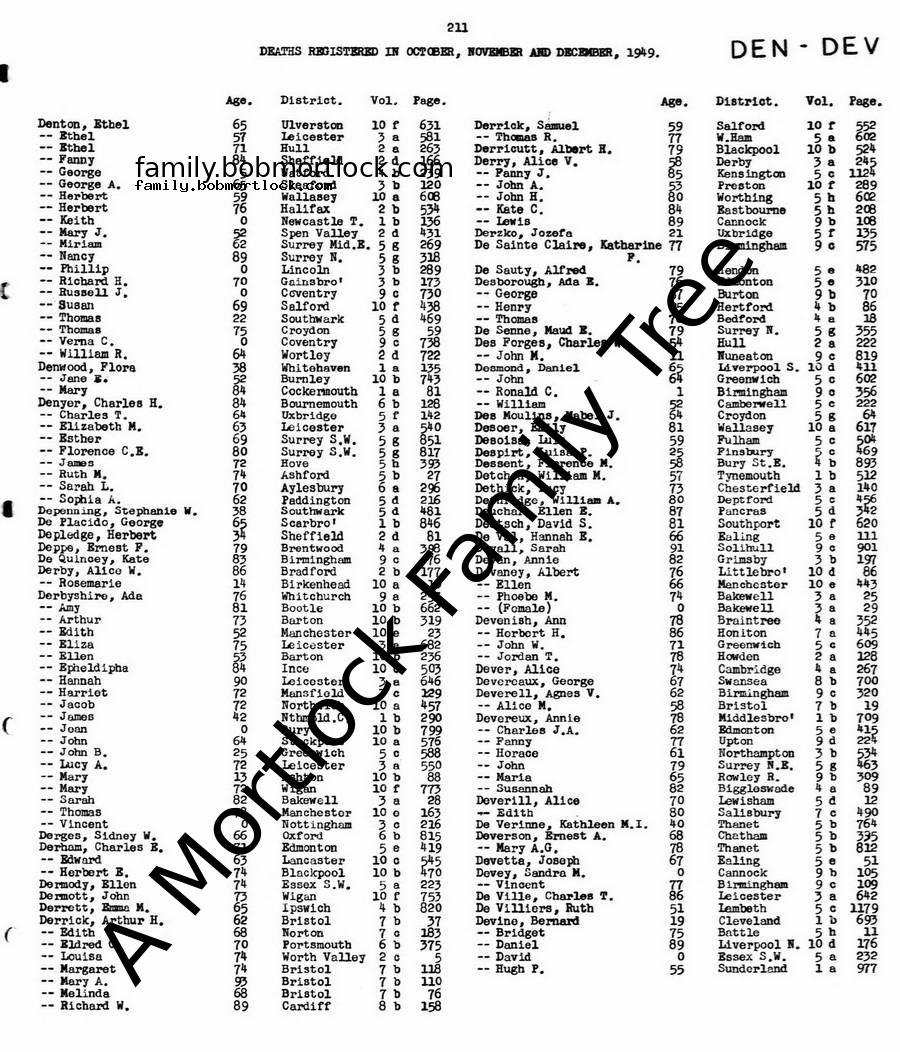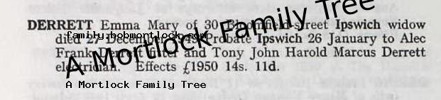 | Probate | 26 January 1950 (30 days after death) Ipswich, Suffolk, England Note: Effects: £1950 14s 11d to Alec Frank Derrett fitter and Tony John Harold Marcus Derrett electrician |