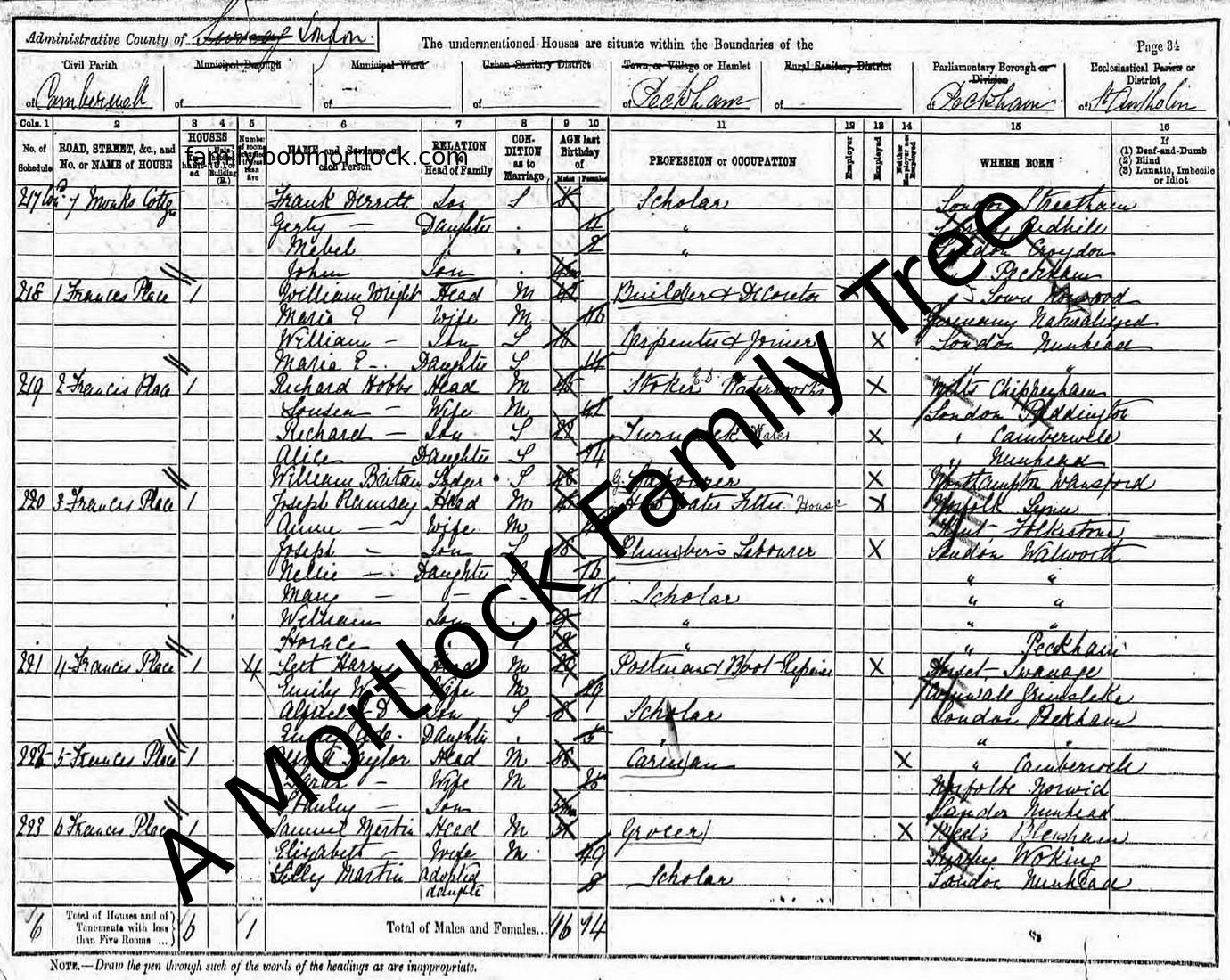 | Census | 5 April 1891 (Age 6) Peckham, SE London, England Address: 7 Monks Cottages