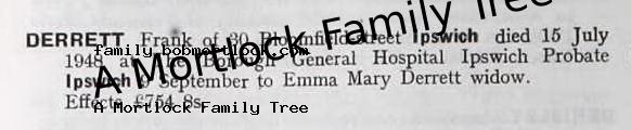| Probate | 9 September 1948 (56 days after death) Ipswich, Suffolk, England Note: Effects: £754 8s to Emma Mary Derrett widow |