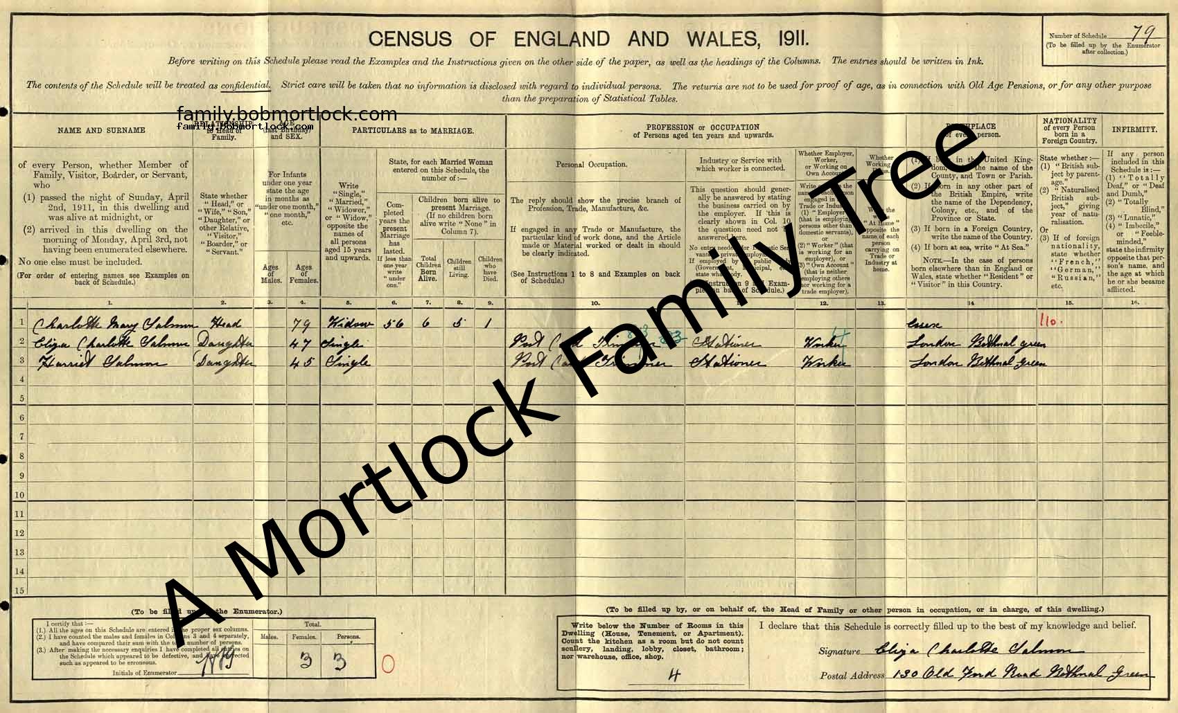 | Census | 2 April 1911 (Age 79) Bethnal Green, E London, England Address: 130 Old Ford Road