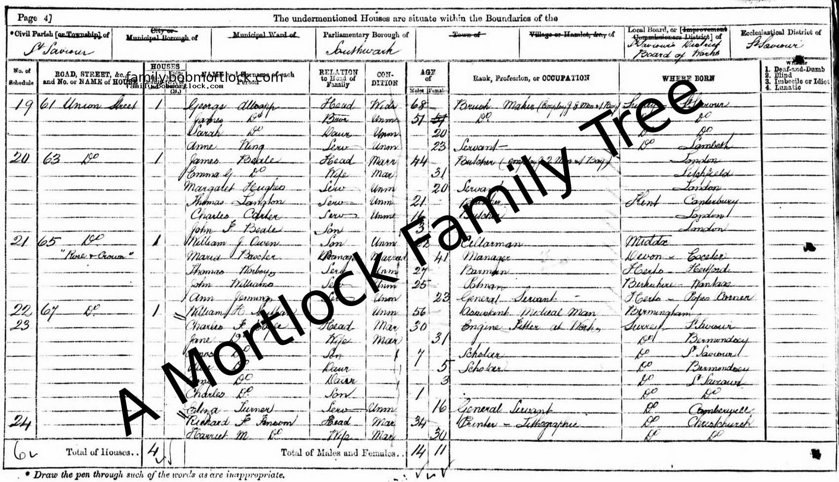 | Census | 2 April 1871 (Age 27) Southwark, S London, England Address: "Rose & Crown", 65 Union Street