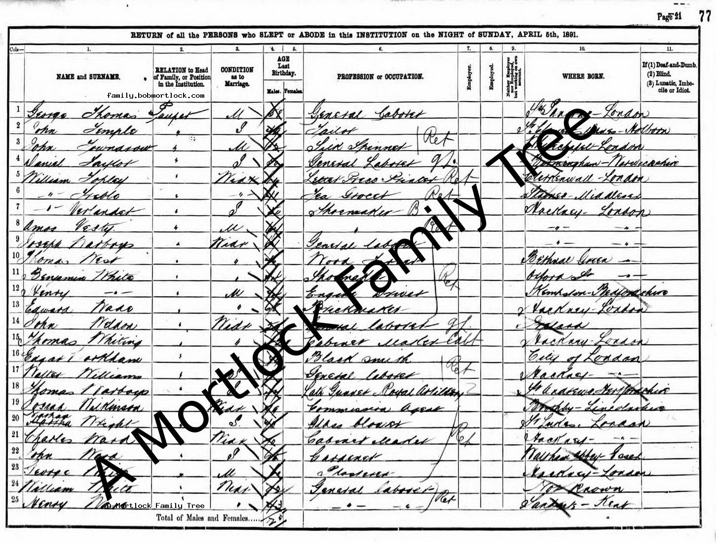 | Census | 5 April 1891 (Age 47) Hackney, E London, England Address: Union Workhouse