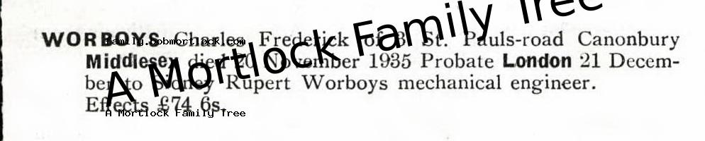 | Probate | 12 December 1935 (22 days after death) London, England Note: Effects: £74 6s to Sidney Rupert Worboys, Mechanical Engineer |