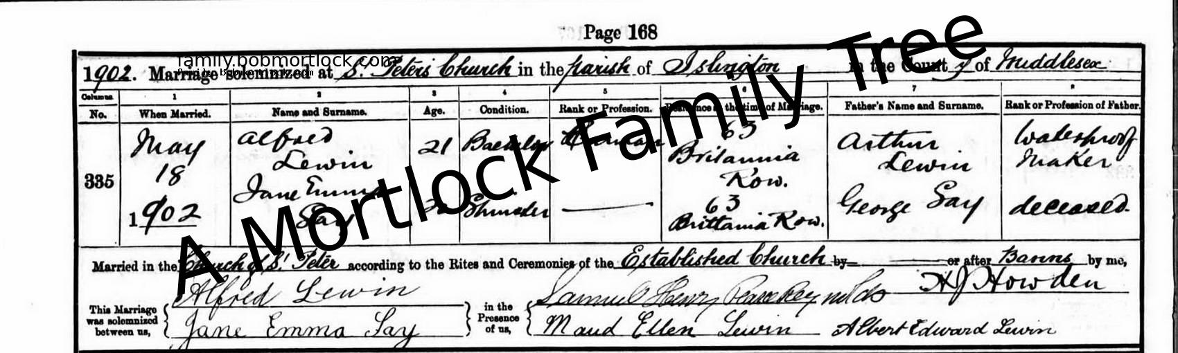 | Religious Marriage | Alfred LEWIN - View family 18 May 1902 (Age 19) Islington, N London, England Address: St Peter