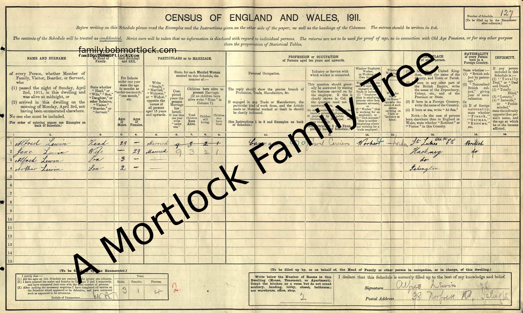 | Census | 2 April 1911 (Age 28) Islington, N London, England Address: 38 Norfolk Road