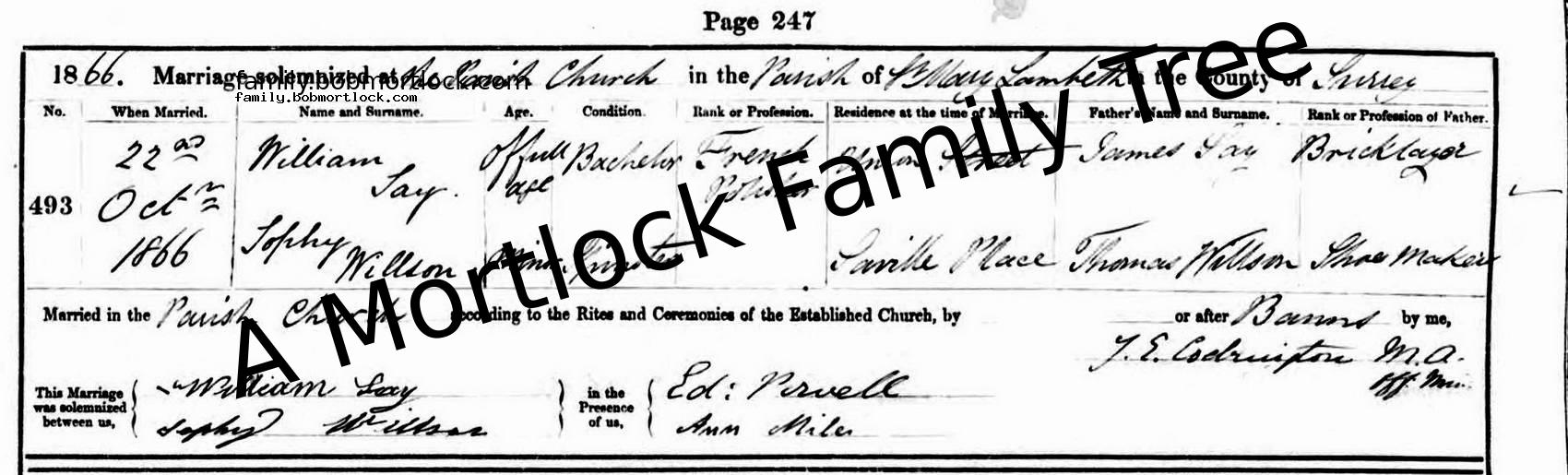 | Religious Marriage | Sophia WILSON - View family 22 October 1866 (Age 19) Lambeth, S London, England Address: St Mary