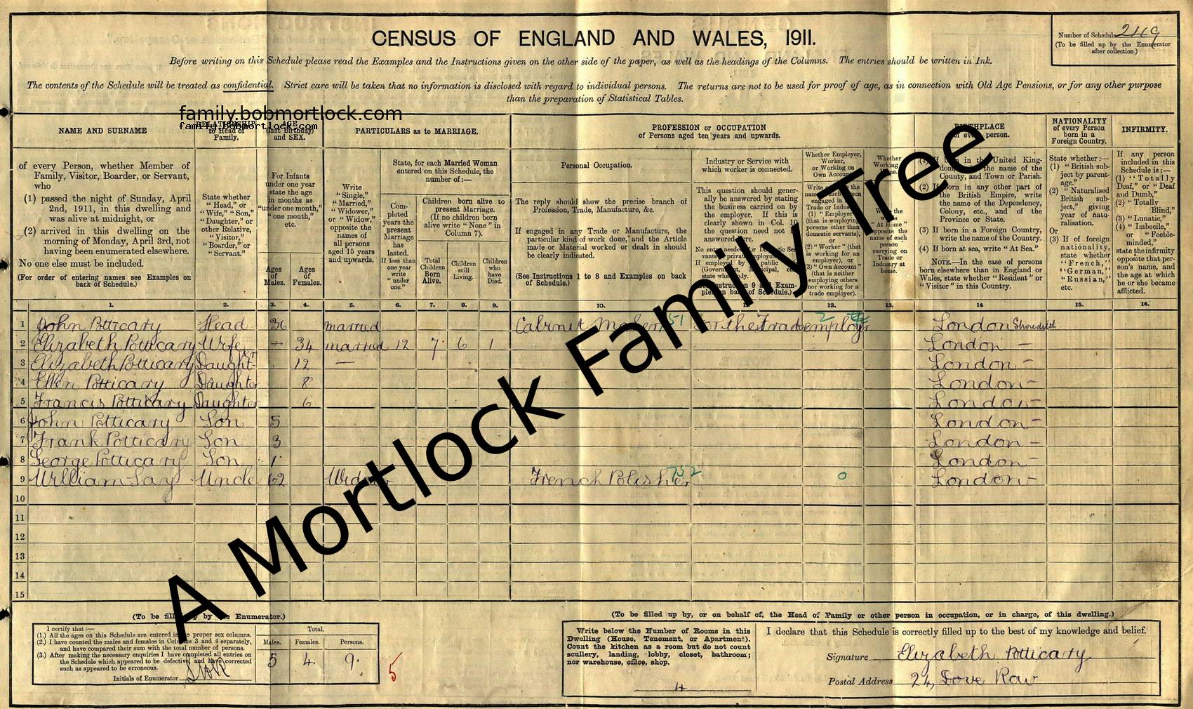 | Census | 2 April 1911 (Age 64) Haggerston, E London, England Address: 24 Dove Row