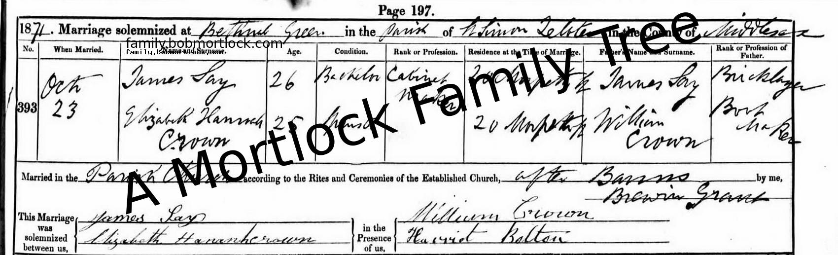 | Religious Marriage | Elizabeth Hannah CROWN - View family 23 October 1871 (Age 25) Bethnal Green, E London, England Address: St Simon Zelotes