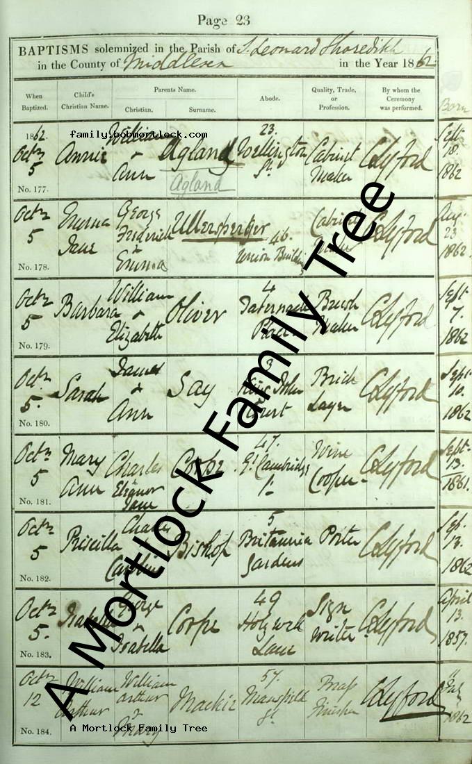 | Baptism | 5 October 1862 (Age 25 days) Shoreditch, E London, England Address: St Leonards |