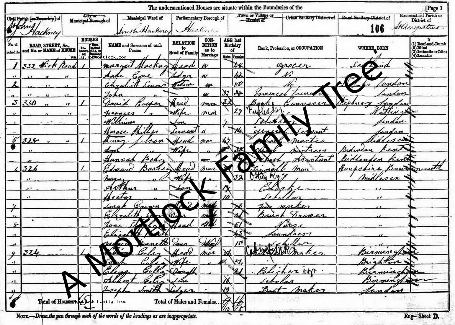 | Census | 3 April 1881 (Age 36) Hackney, E London, England Address: 326 Wick Road