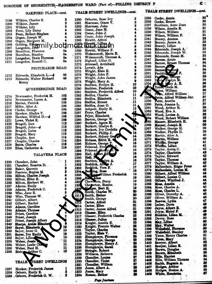 | Residence | 1947 (Age 21) Haggerston, E London, England Address: 7 Talavera Place |
