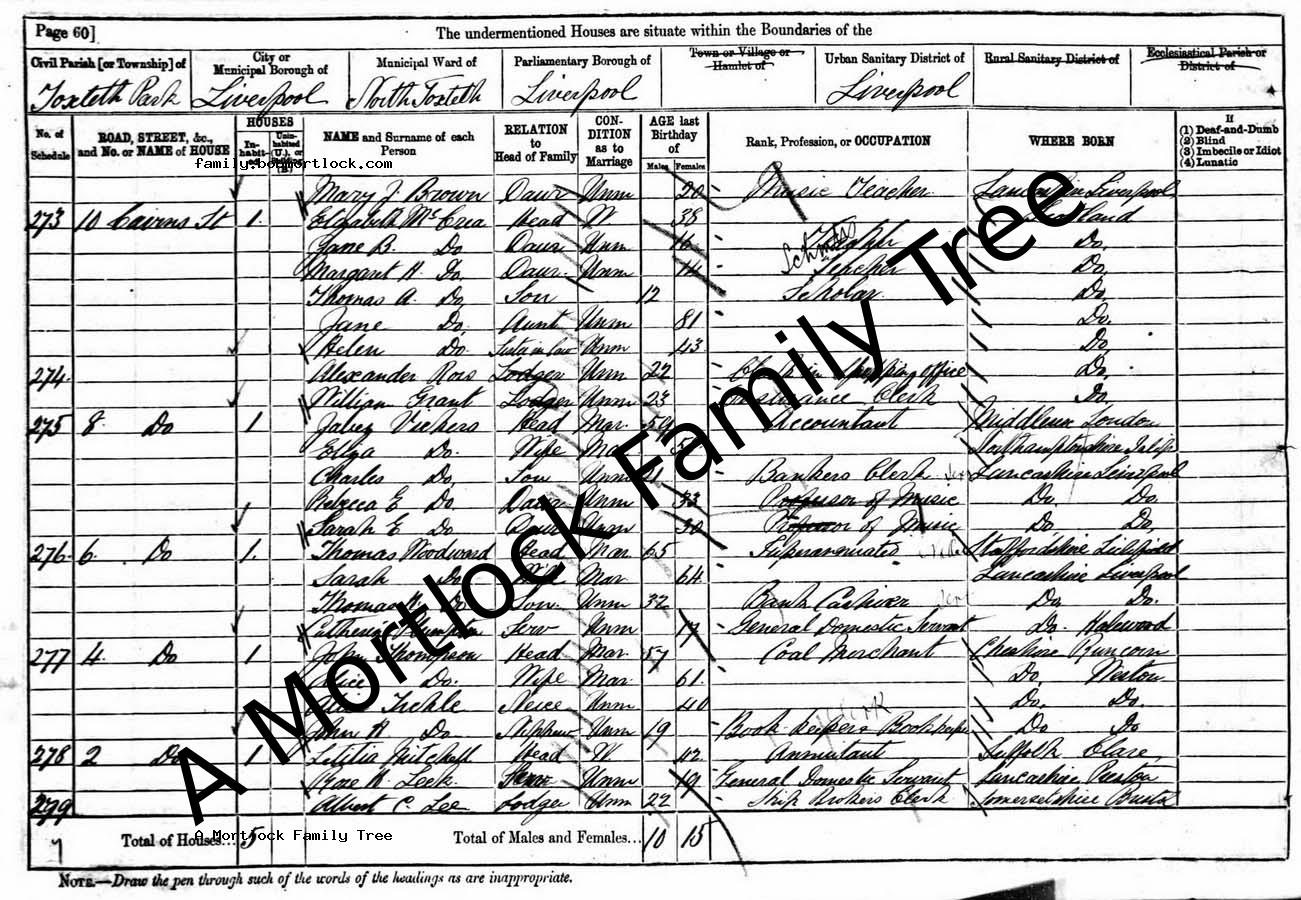 | Census | 3 April 1881 (Age 53) Toxteth, Lancashire, England Address: 72 Cairns Road