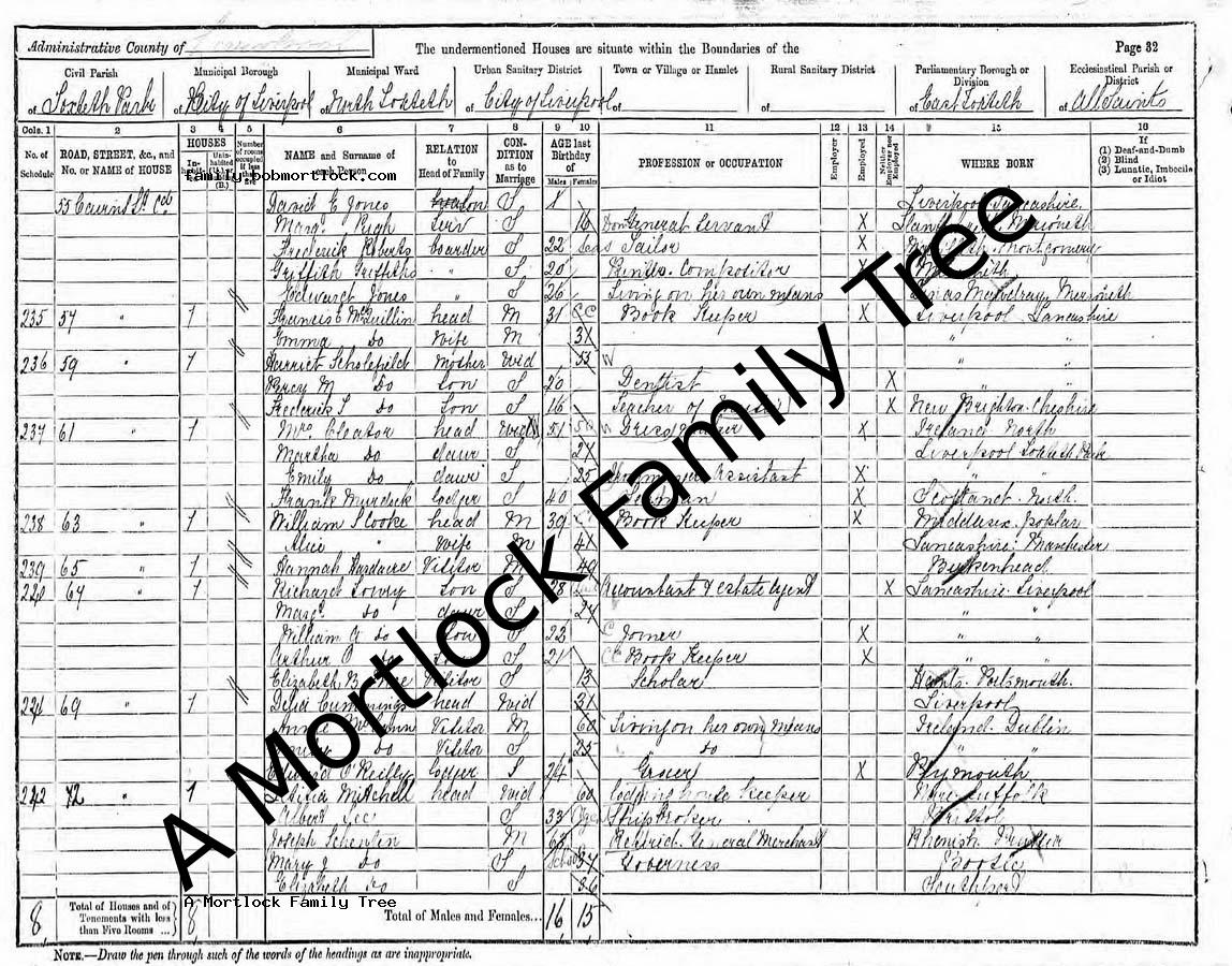 | Census | 5 April 1891 (Age 63) Toxteth, Lancashire, England Address: 72 Cairns Road