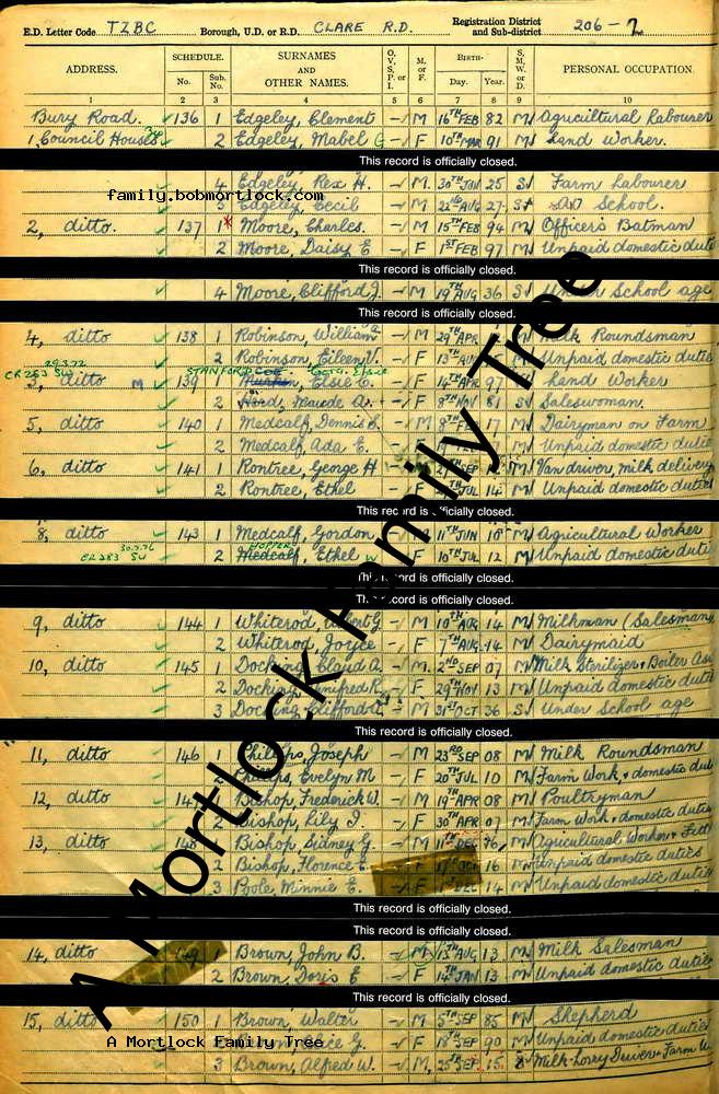 | Census | 29 September 1939 (Age 49) Clare, Suffolk, England Address: 15 Council Houses, Bury Road