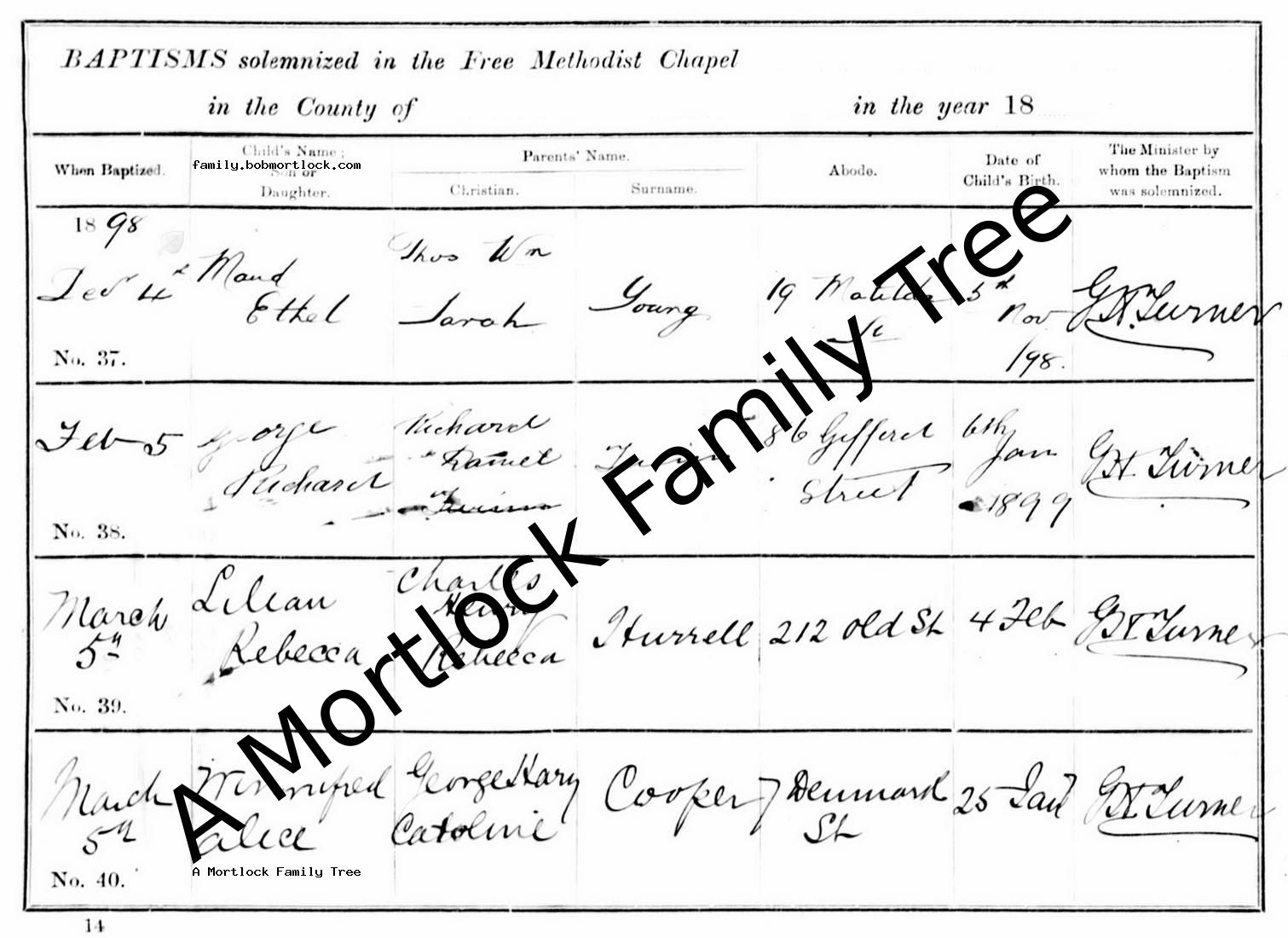 | Baptism | 5 March 1899 (Age 29 days) Islington, N London, England Address: Free Methodist Church |