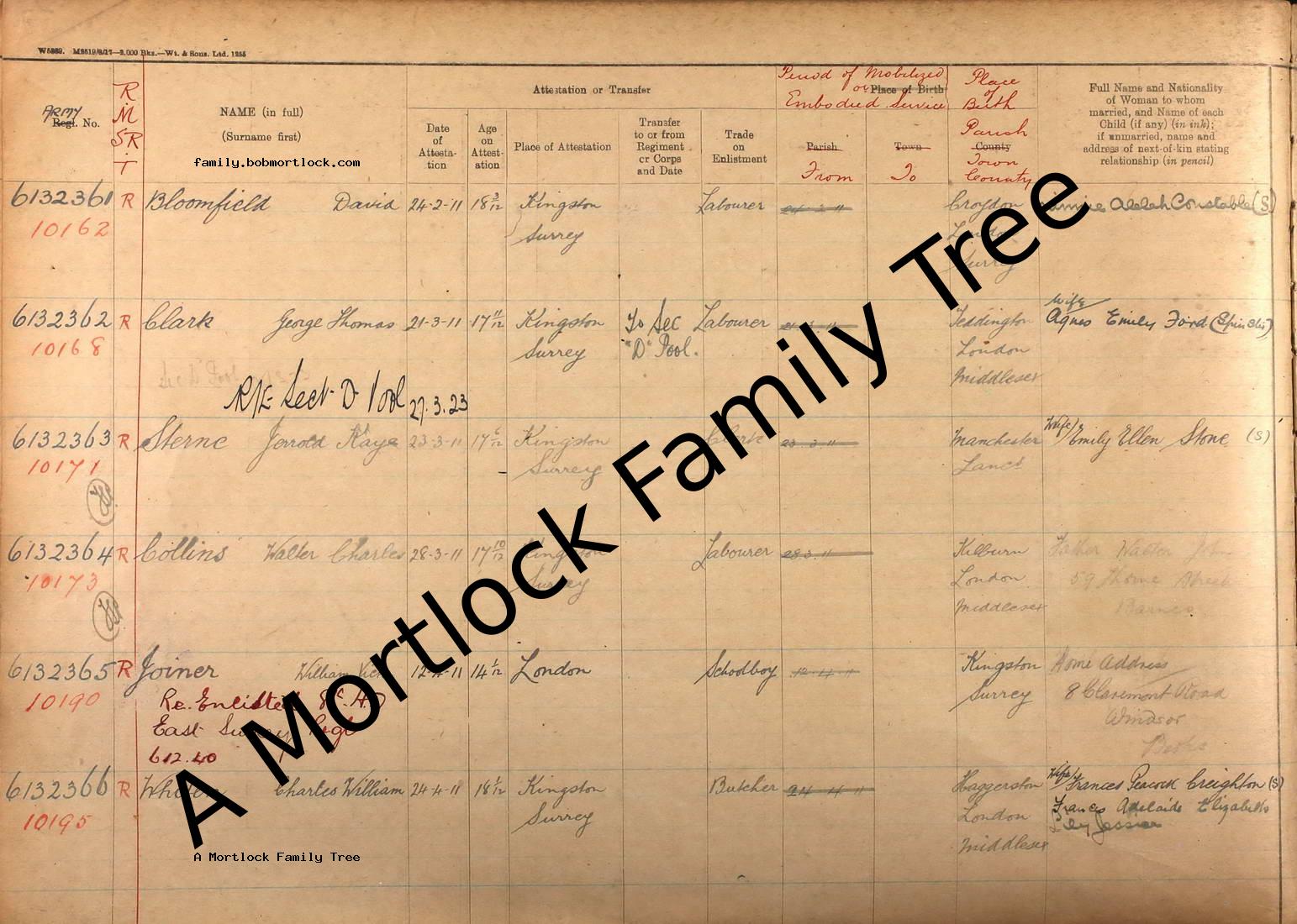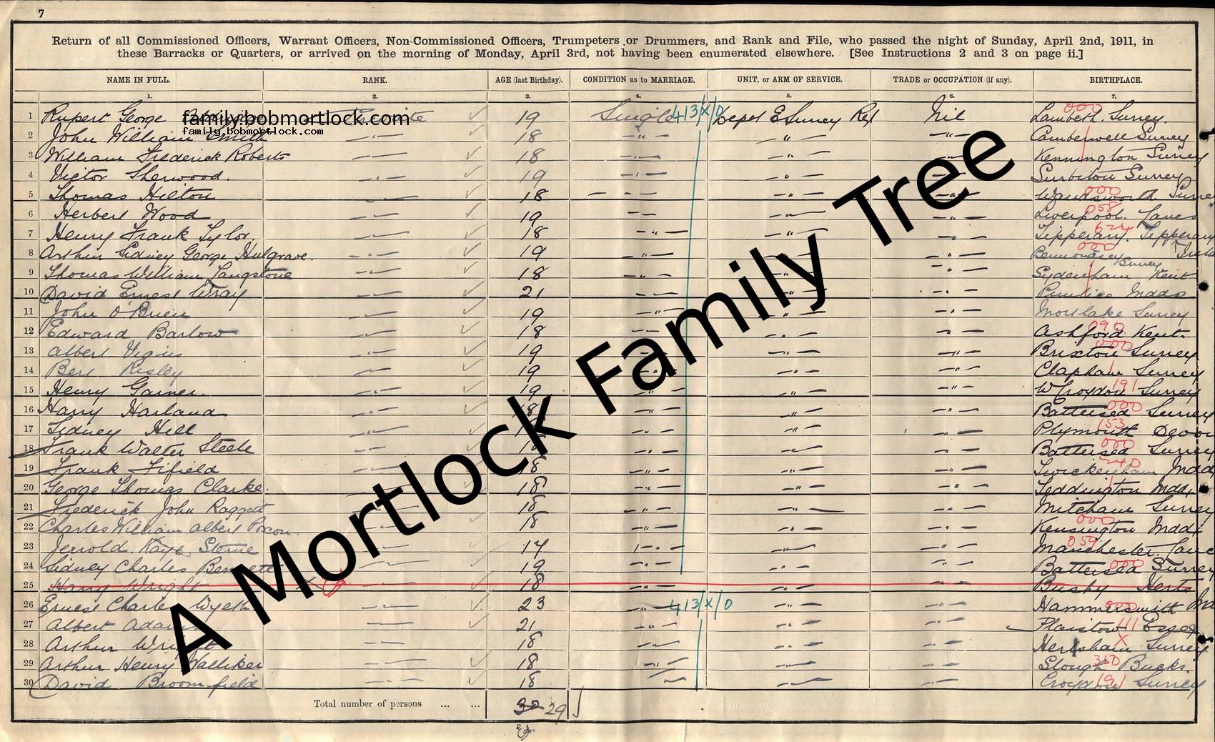 | Census | 2 April 1911 (Age 17) Kingston, Surrey, England Address: Kingston Barracks |