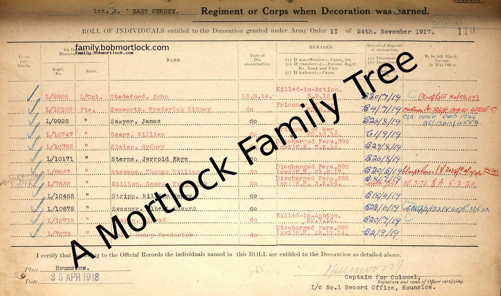| Military | Type: Medal and Award Rolls 25 April 1918 (Age 24)Agency: 1st Battalion, East Surrey Regiment |