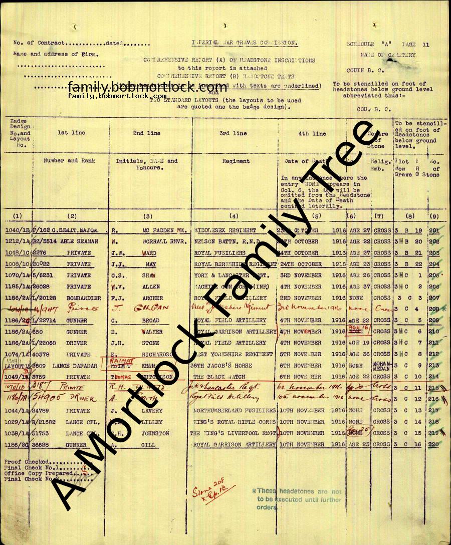 | Burial | 4 November 1916 (on the date of death) Pas-de-Calais, France Address: Couin British, New British and Communal Cemeteries |