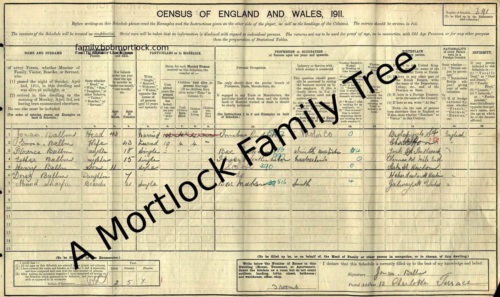 | Census | 2 April 1911 (Age 11) Islington, N London, England Address: 12 Charlotte Terrace |