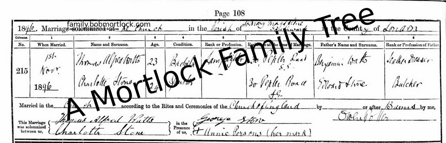 | Religious Marriage | Thomas Alfred WATTS - View family 1 November 1896 (Age 24) Southwark, S London, England Address: St Mary Magdalene