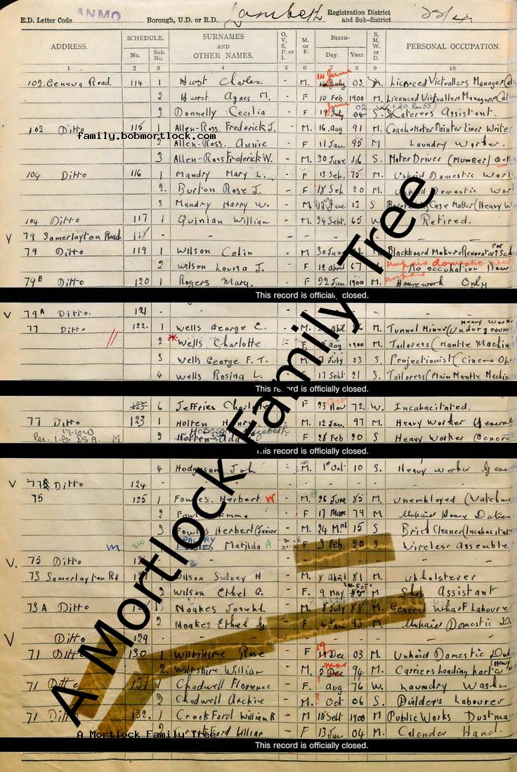 | Census | 29 September 1939 (Age 66) Lambeth, S London, England Address: 77 Somerlayton Road