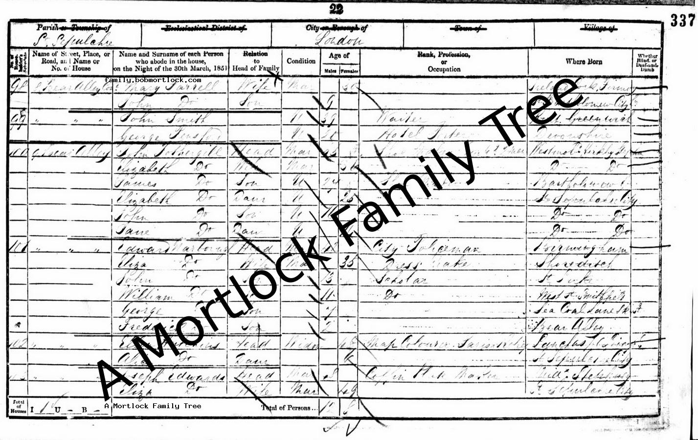 | Census | 30 March 1851 (Age 47) City of London, England Address: 9 Bear Alley