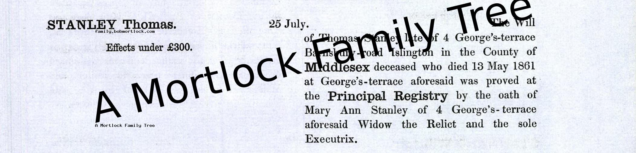 | Probate | 23 July 1861 (2 months after death) London, England Note: Effects: Under £300 to Mary Ann Stanley, Widow |