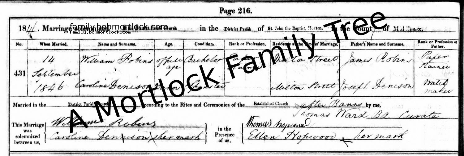 | Religious Marriage | William Henry ROBINS - View family 14 September 1846 (Age 16) Hoxton, E London, England Address: St John the Baptist