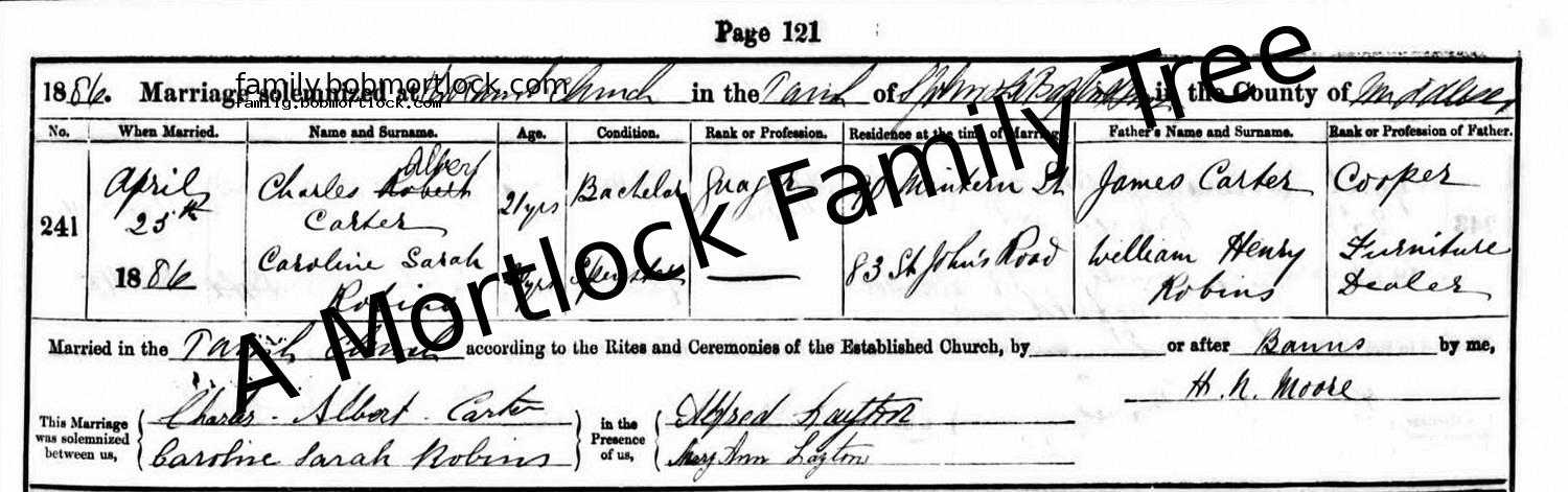 | Religious Marriage | Caroline Sarah ROBINS - View family 25 April 1886 (Age 20) Hoxton, E London, England Address: St John the Baptist