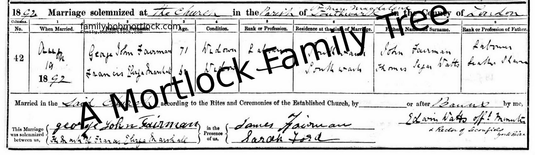 | Religious Marriage | Frances Eliza "Fanny" WATTS - View family 19 August 1892 (Age 71) Southwark, S London, England Address: St Mary Magdalene