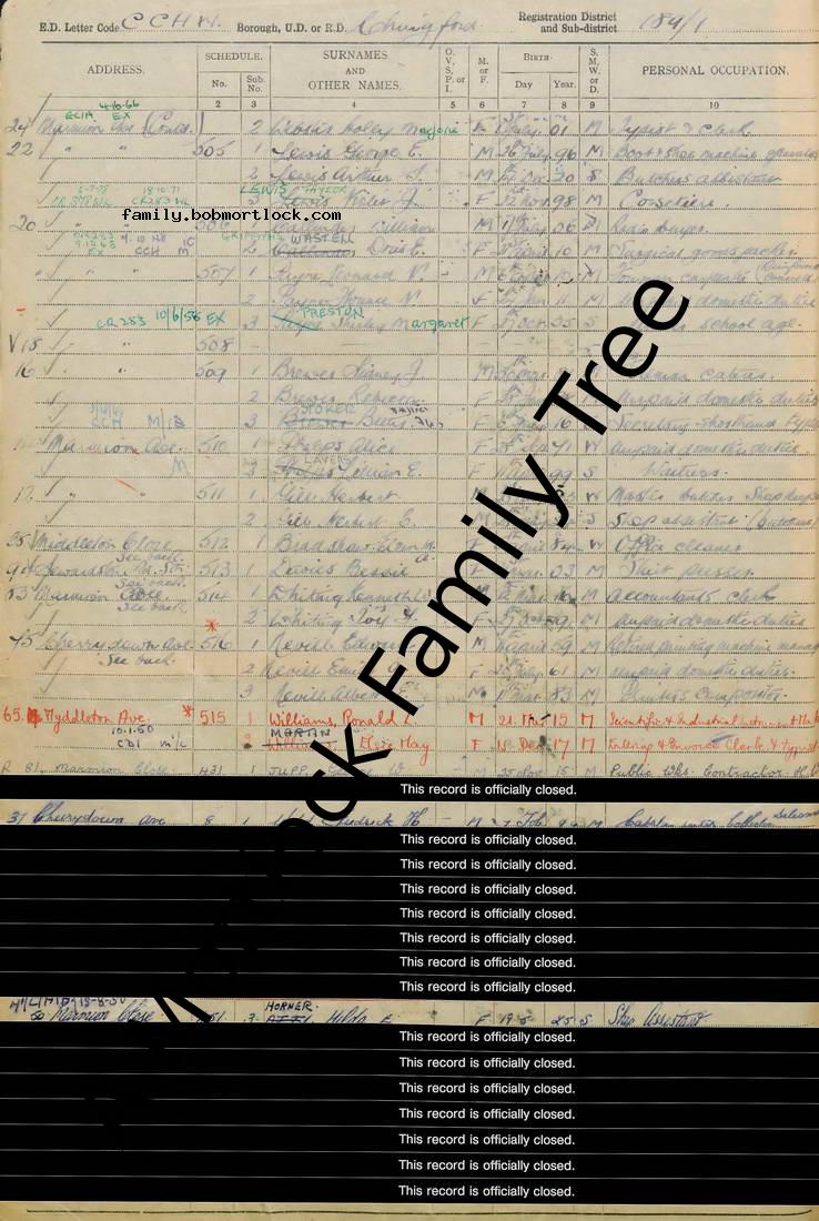 | Census | 29 September 1939 (Age 40) Chingford, Essex, England Address: 22 Marmion Avenue