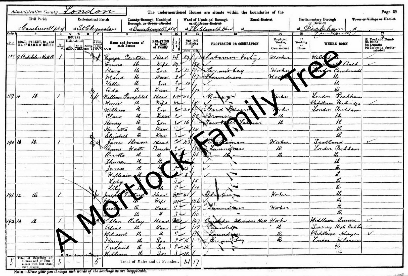 | Census | 5 April 1891 (Age 27) Peckham, SE London, England Address: 4 Blue Anchor Lane