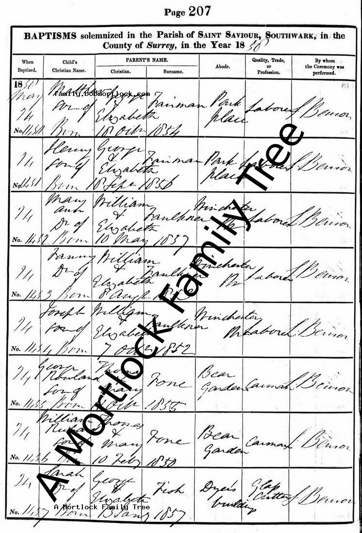 | Baptism | 24 May 1858 (Age 3) Southwark, S London, England Address: St Saviour |