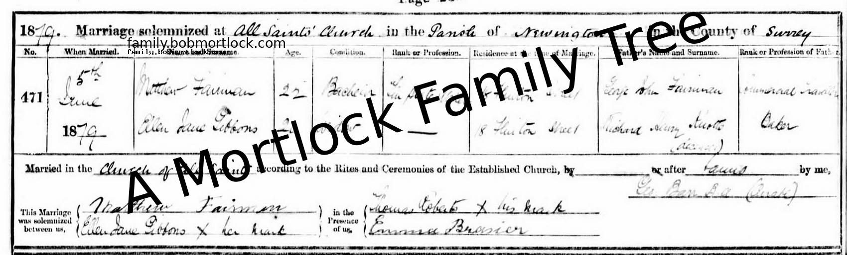 Religious Marriage: 5 June 1879 — Newington, S London, England |