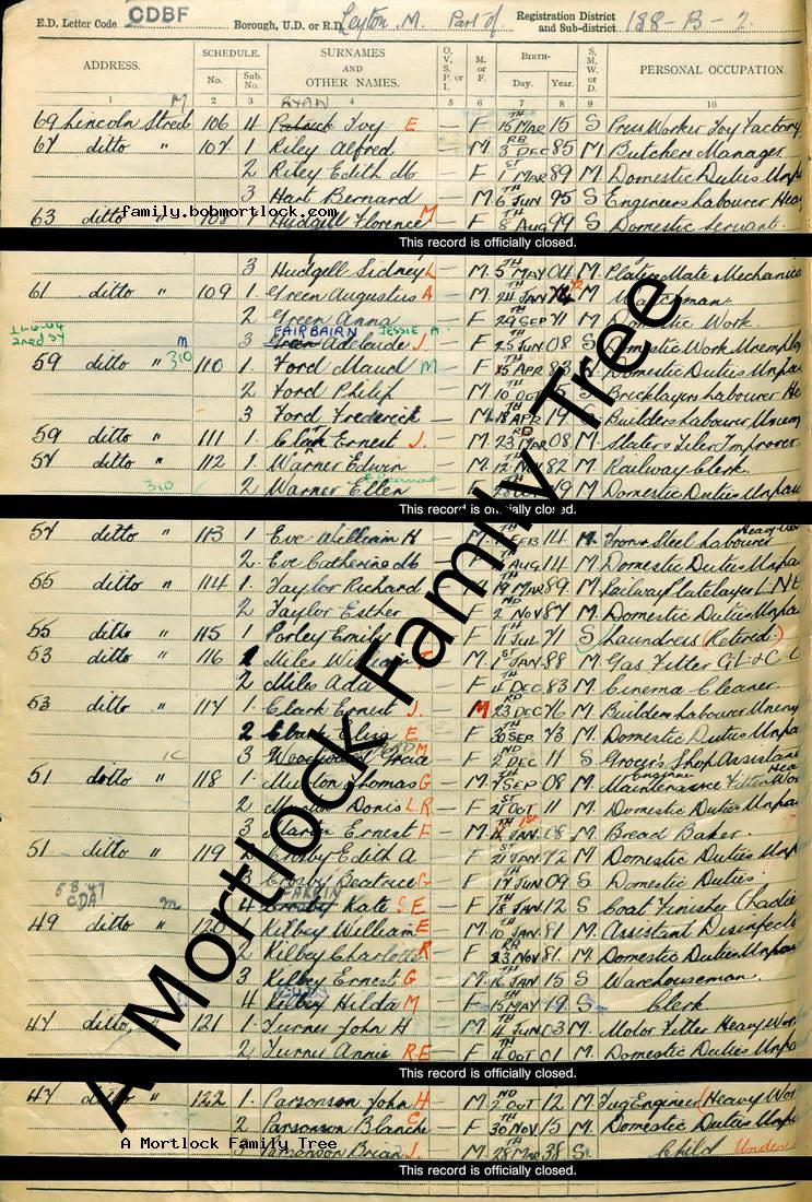 | Census | 29 September 1939 (Age 50) Leyton, E London, England Address: 55 Lincoln Street