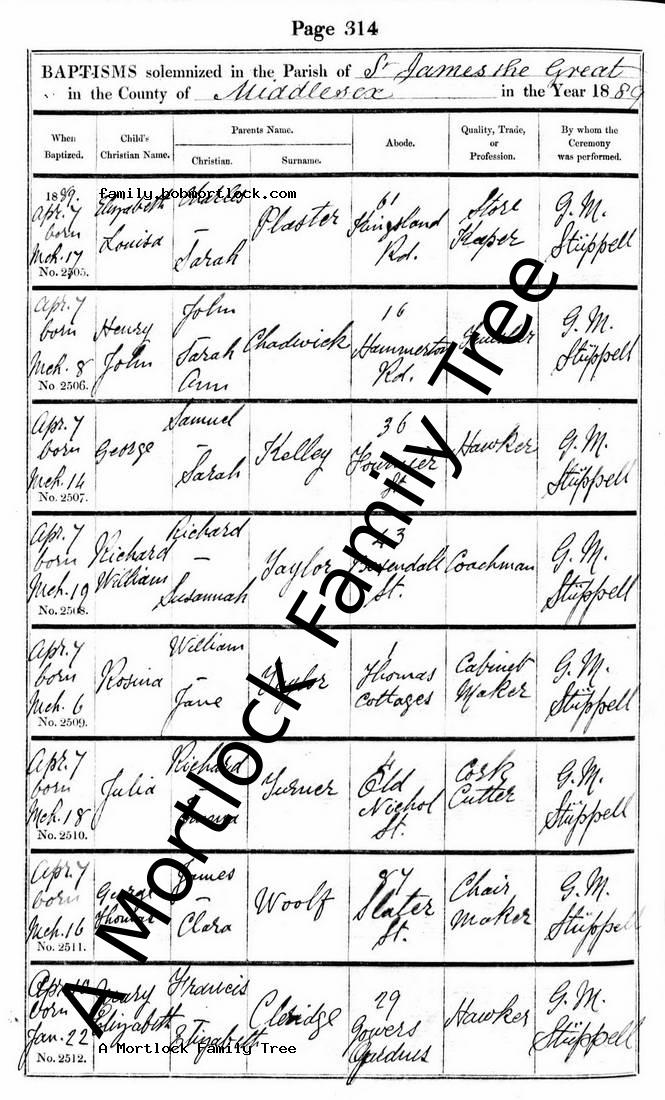 | Baptism | 7 April 1889 (Age 19 days) Bethnal Green, E London, England Address: St James the Great |