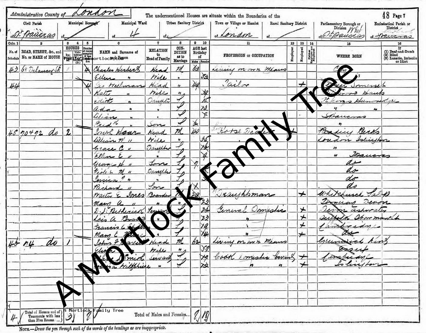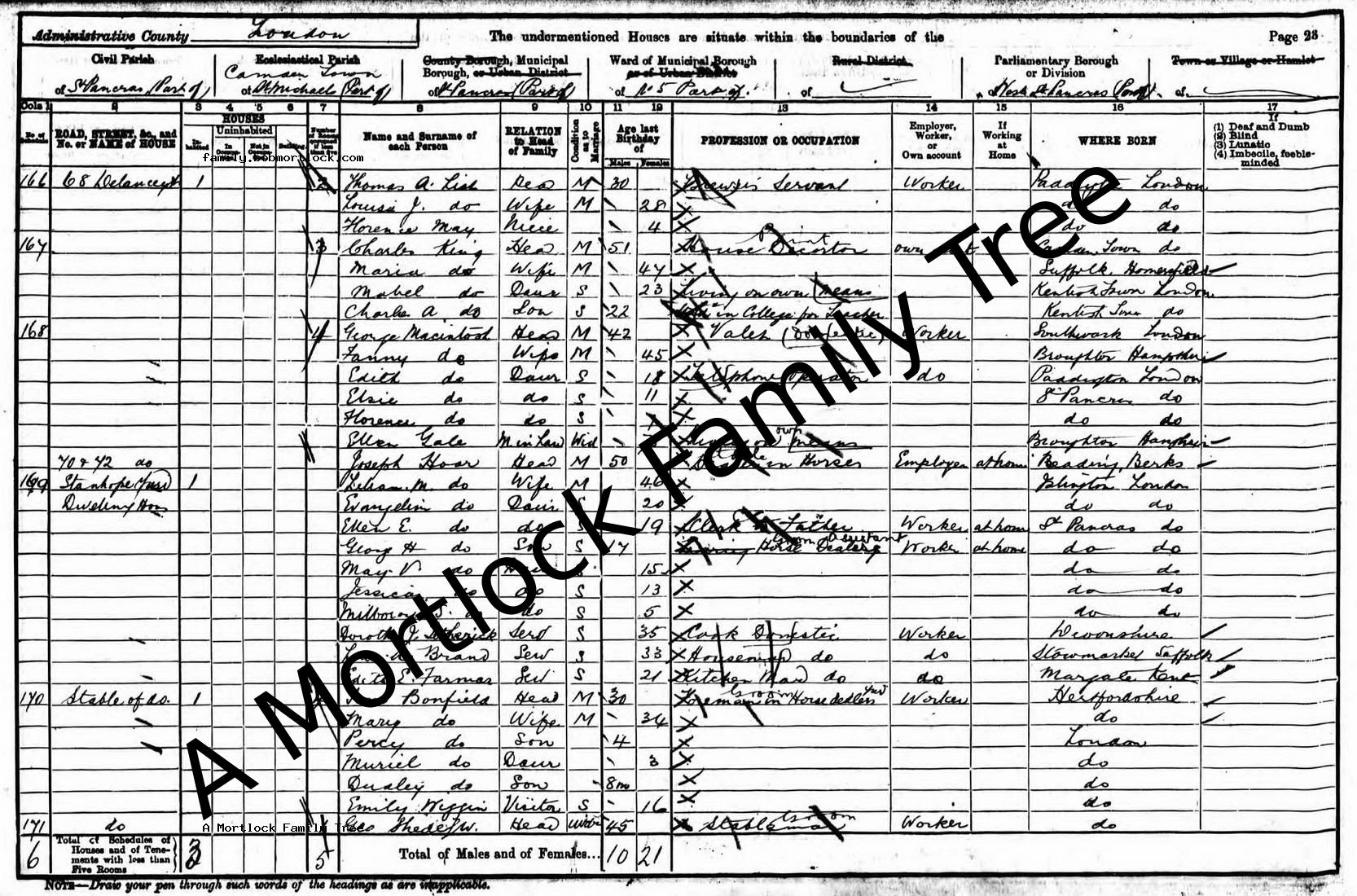 | Census | 31 March 1901 (Age 50) St Pancras, C London, England Address: 70 & 72 Delancey Street