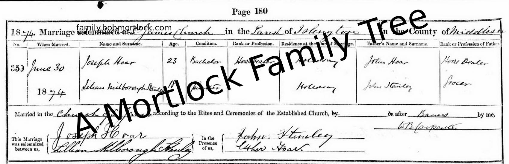 | Religious Marriage | Lilylian Milborough STANLEY - View family 30 June 1874 (Age 23) Holloway, London, England Address: St James
