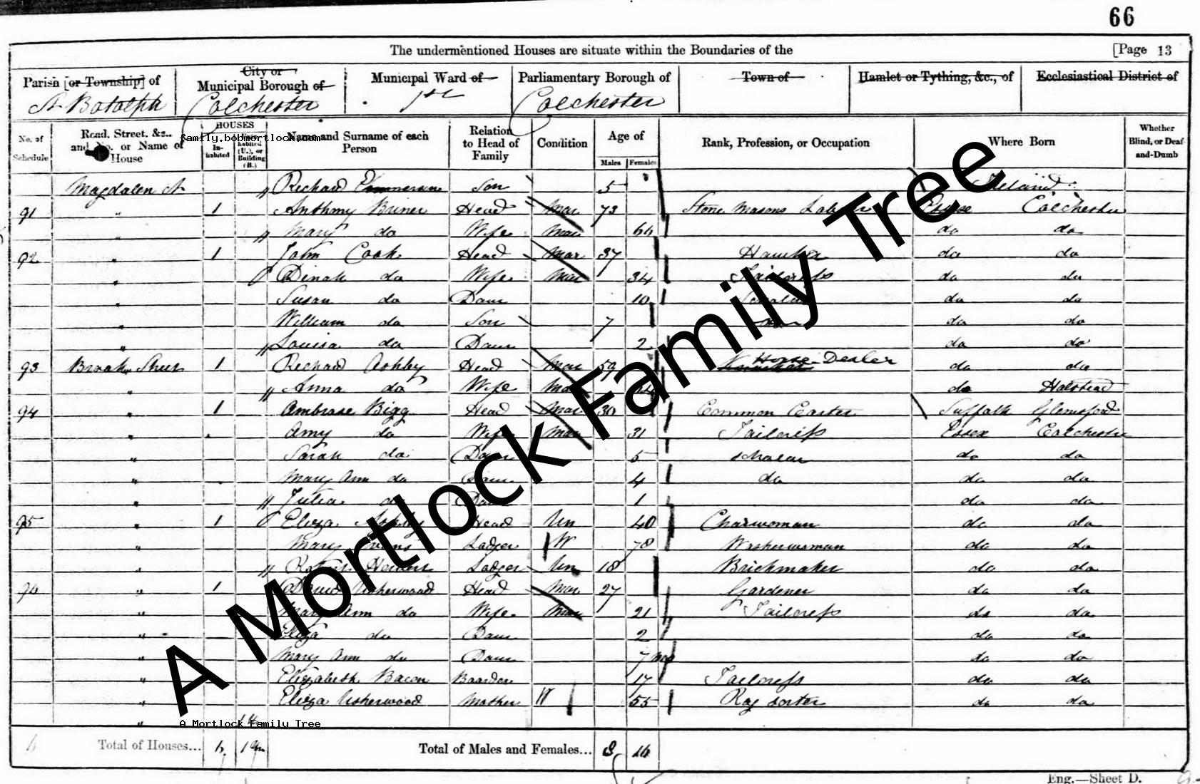 | Census | 7 April 1861 (Age 63) Colchester, Essex, England Address: Magdalen Street