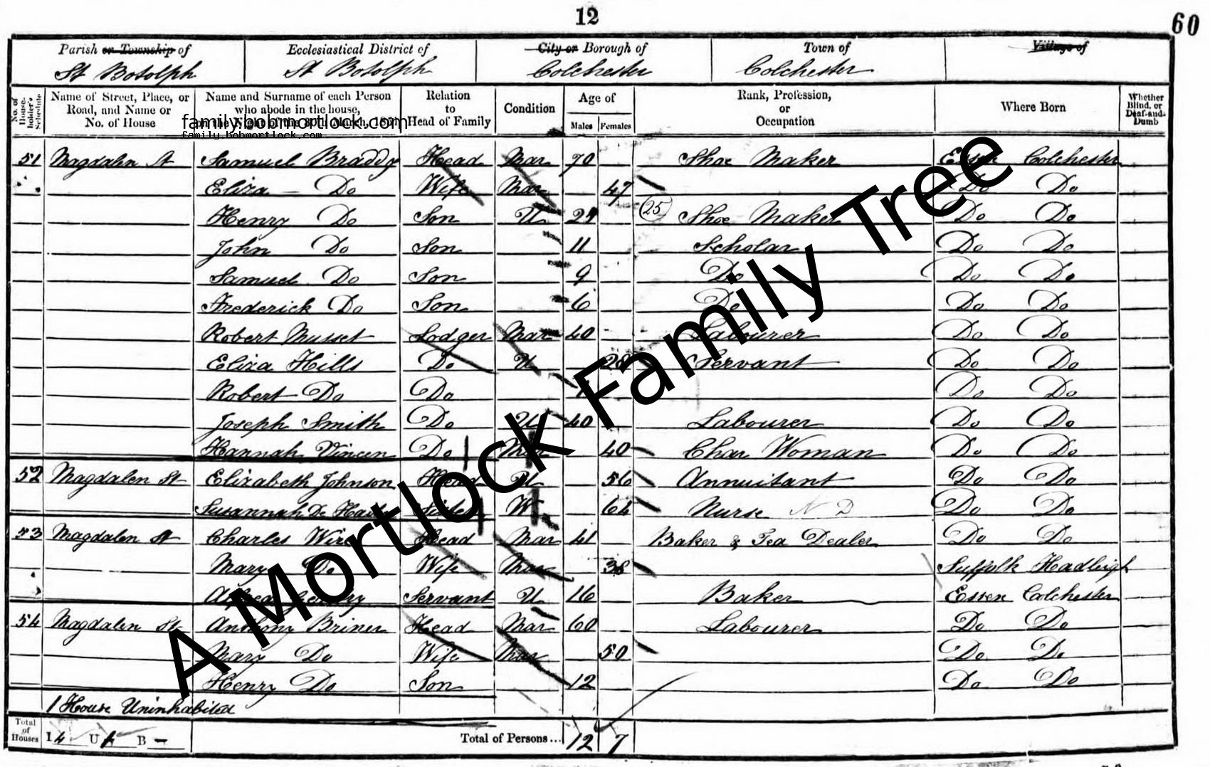 | Census | 30 March 1851 (Age 53) Colchester, Essex, England Address: Magdalen Street