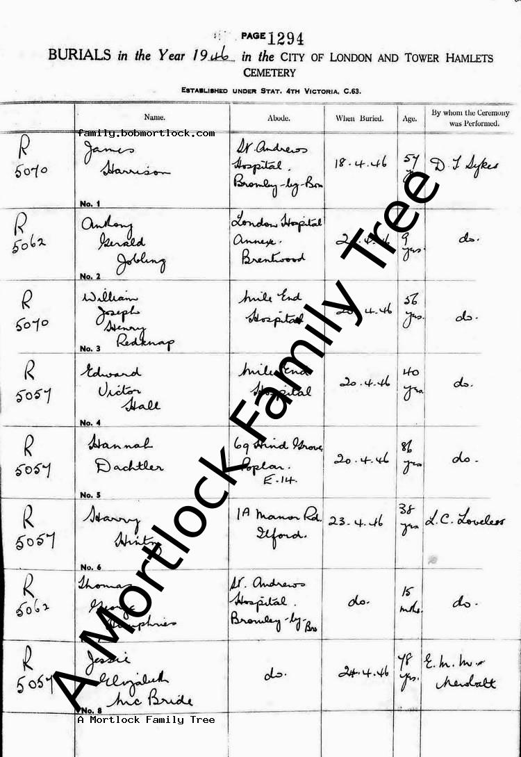 | Burial | 20 April 1946 (Age 57) Tower Hamlets, E London, England |