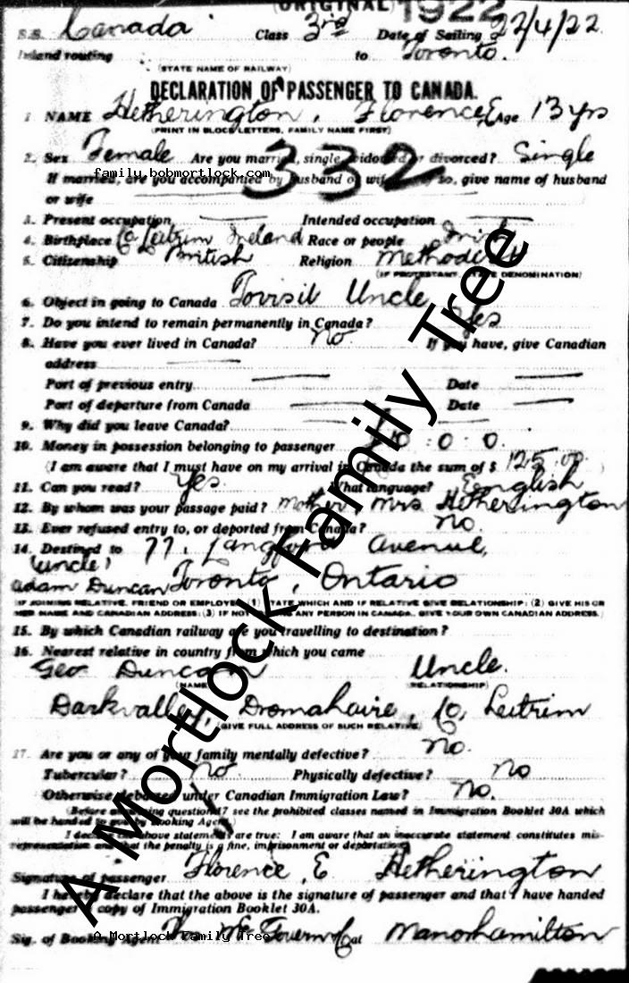 | Emigration | 27 April 1922 (Age 13) Manorhamilton, Ireland |