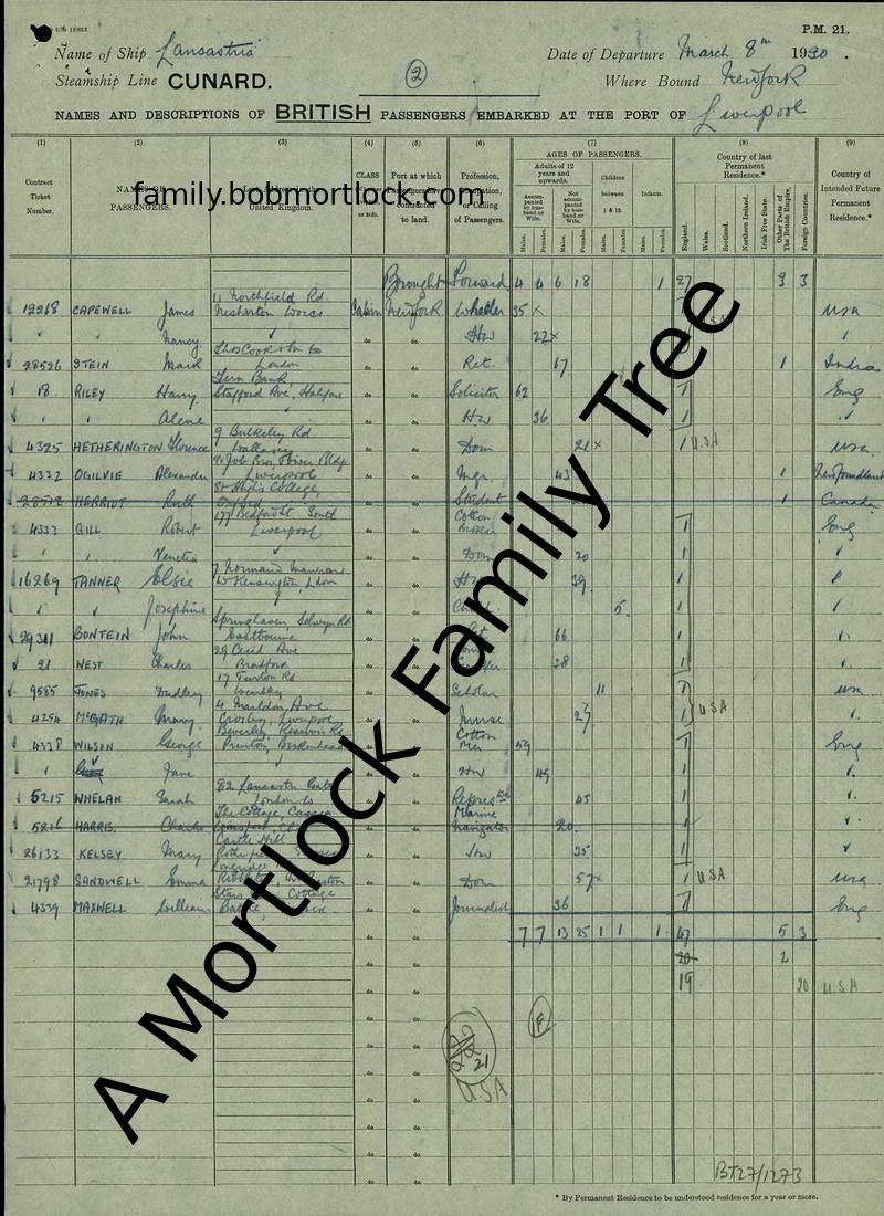 | UK Departure | 8 March 1930 (Age 21) Liverpool, Lancashire, England |
