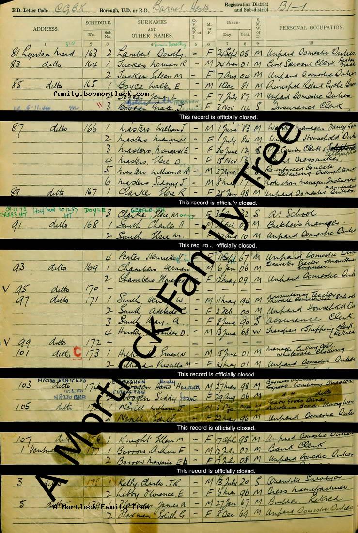 | Census | 29 September 1939 (Age 55) Barnet, Middlesex, England Address: 87 Lynton Head |