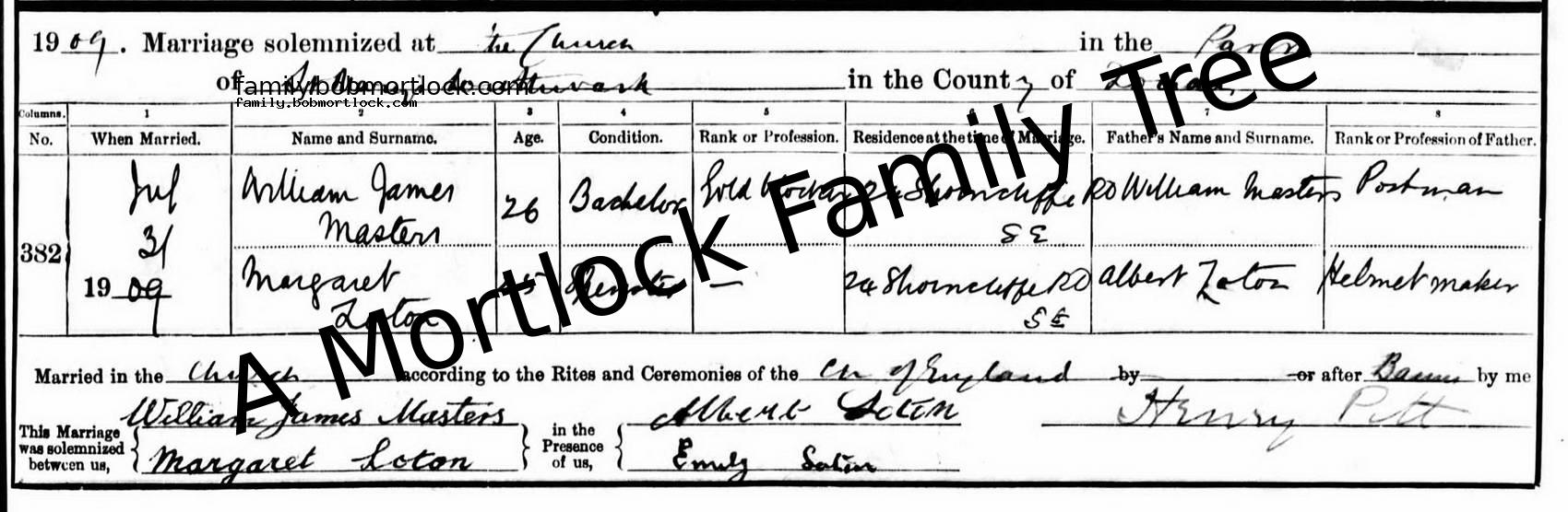| Religious Marriage | William James MASTERS - View family 3 July 1909 (Age 25) Southwark, S London, England Address: St Mary Magdalene