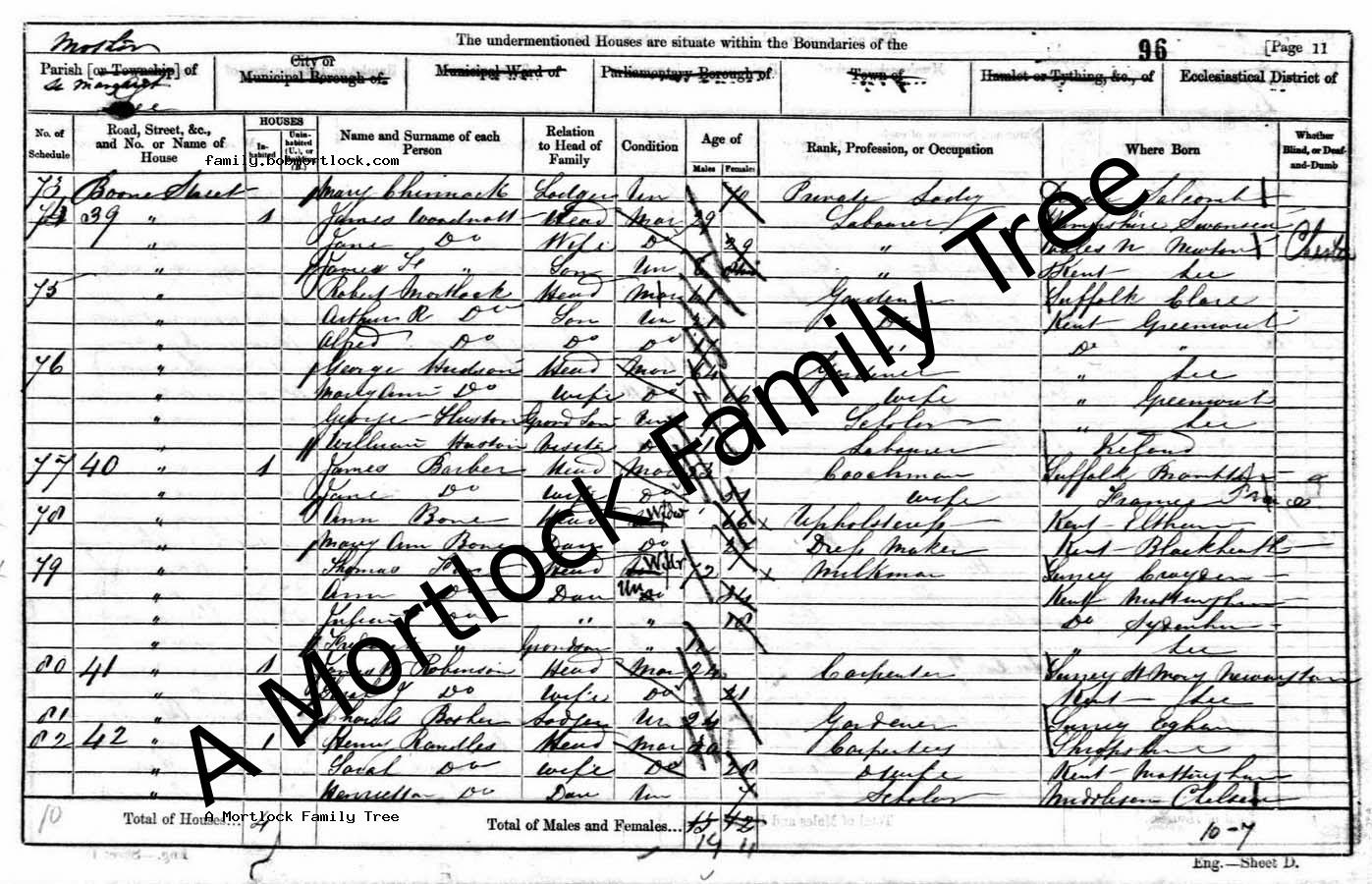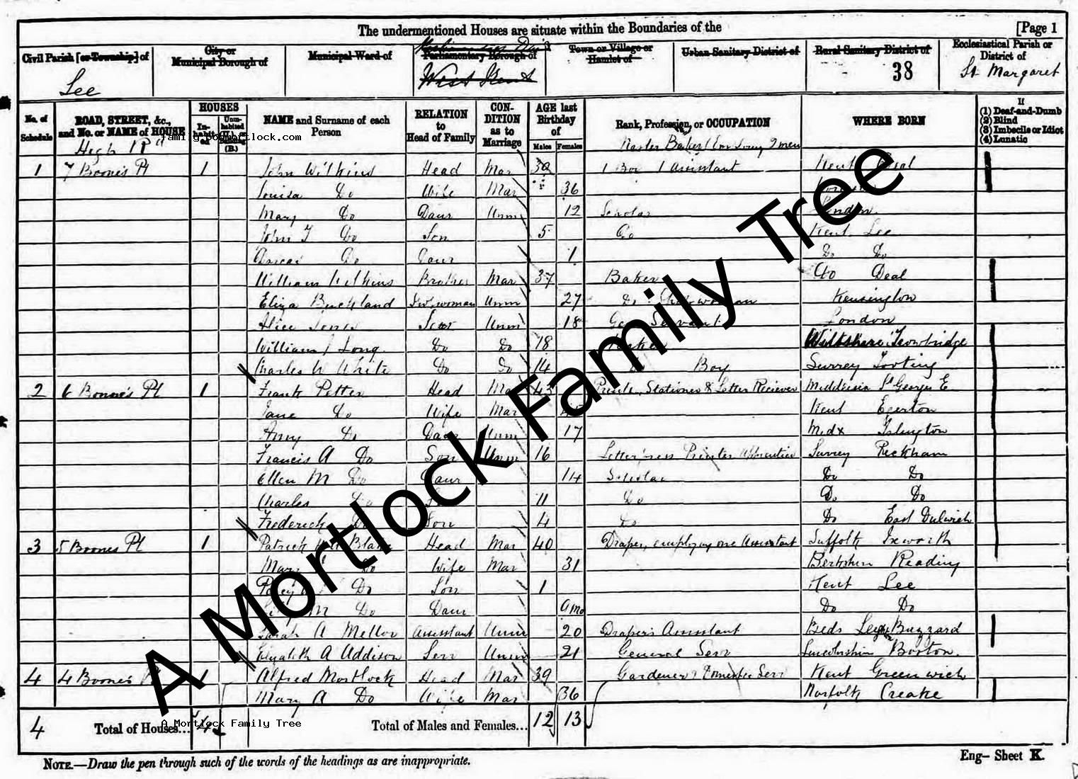 | Census | 3 April 1881 (Age 39) Lee, SE London, England Address: 4 Boone Place, High Road
