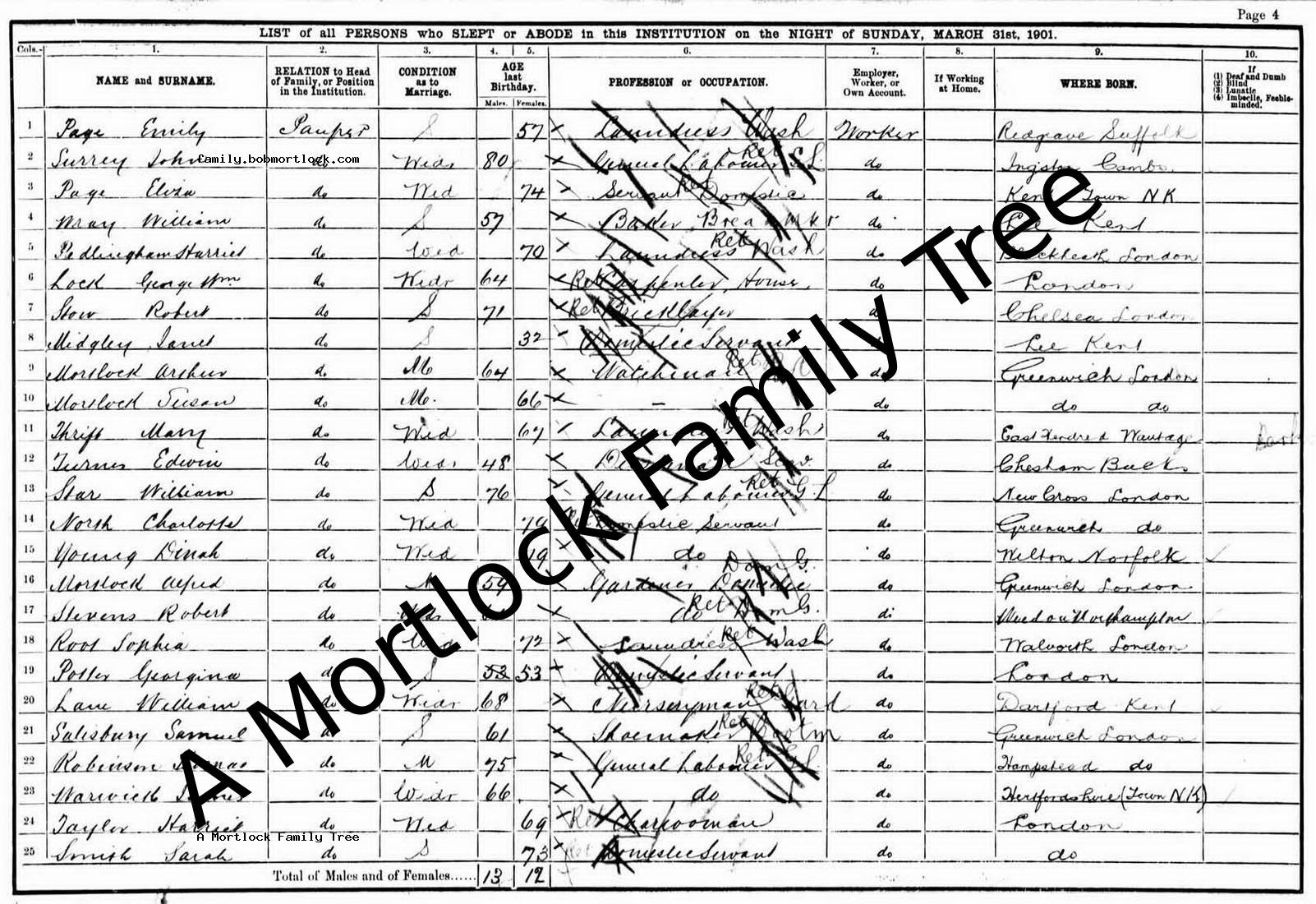 | Census | 31 March 1901 (Age 59) Lewisham, SE London, England Address: Lewisham Union Workhouse