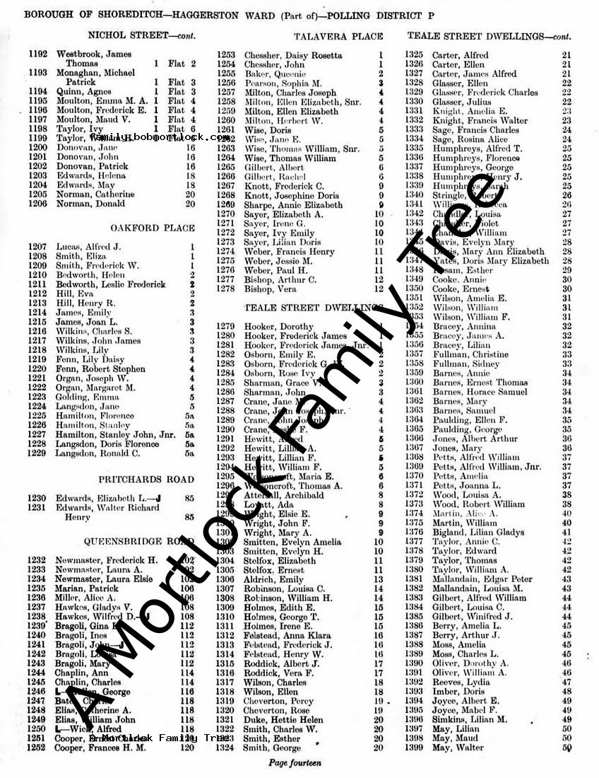 | Residence | 1949 (Age 21) Haggerston, E London, England Address: 9 Talavera Place |