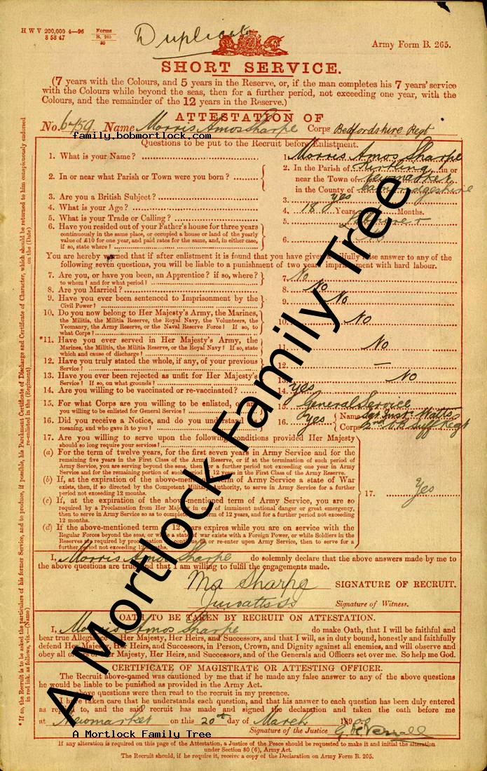 | Military Service | Type: Attestation 20 March 1900 (Age 17) Newmarket, Cambridgeshire, England Agency: Bedfordshire Regiment |