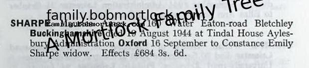 | Probate | 16 September 1944 (28 days after death) Oxford, Oxfordshire, England Note: Effects: £684 3s 6d to Constance Emily Sharpe widow |